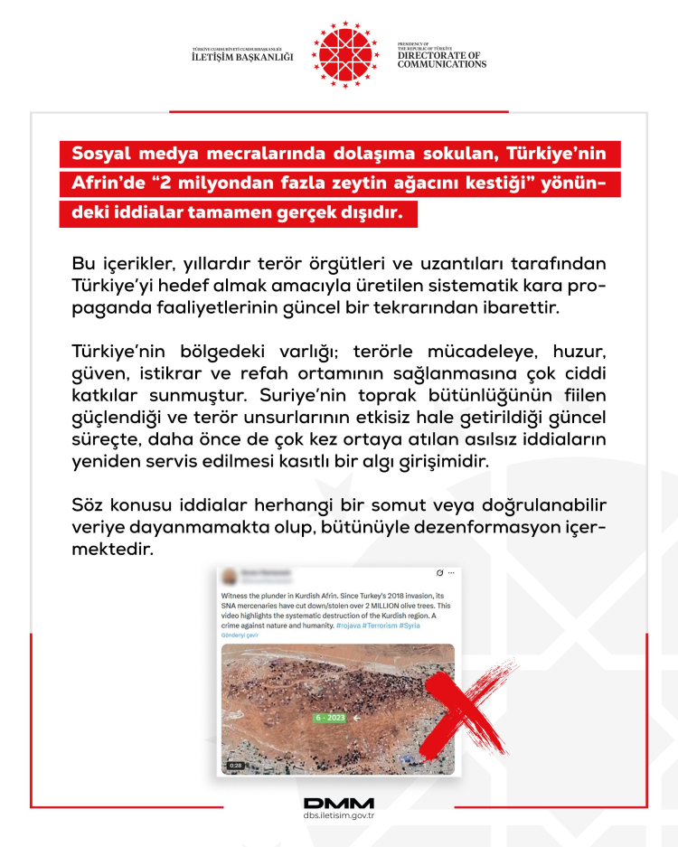 İletişim Başkanlığı Dezenformasyonla Mücadele Merkezi, Türkiye’nin Afrin’de 2 milyondan fazla zeytin ağacını kestiği yönündeki iddiaların tamamen asılsız ve kara propaganda ürünü olduğunu açıkladı.