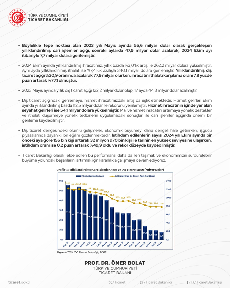 Ticaret Bakanı Prof. Dr. Ömer Bolat, 2024 Ekim Ayı Cari İşlemler İstatistiklerine ilişkin değerlendirmelerde bulundu. Bakan Bolat, 10 ayda cari işlemler açığı 32,8 milyar dolar azalarak, 3,3 milyar dolara gerilediğini söyledi.