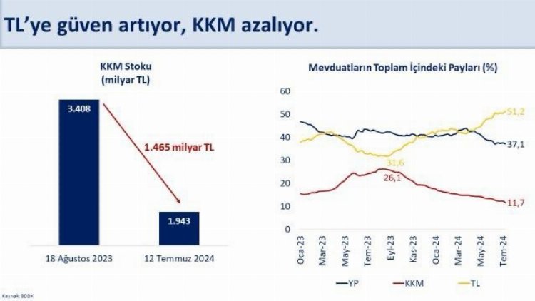 “KKM stoku TL bazında zirvesi olan geçen yıl Ağustos ayına kıyasla 47 haftadır kesintisiz gerileyerek 1,5 trilyon TL azaldı” diyen Bakan Şimşek, paylaşımında, “KKM’nin payı azalırken TL mevduatın toplam mevduat içindeki payı 19 puanın üzerinde artarak yüzde 51,2 seviyesine ulaştı. Döviz dönüşümlü KKM hesaplarına uygulanan faiz alt sınırının azaltılması ve firmaların KKM hesaplarındaki vergi istisnasının sona ermesine ilave olarak ağustos ayından itibaren bireysel KKM hesaplarının da stopaja tabi olmasıyla birlikte bu sürecin hızlanmasını bekliyoruz. Uyguladığımız politikalarla makro finansal istikrar güçleniyor ve ekonomimiz daha dayanıklı hale geliyor” görüşlerine yer verdi.