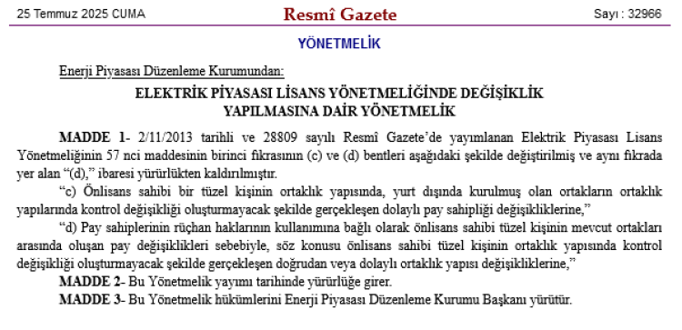 Enerji Piyasası Düzenleme Kurumu (EPDK), Elektrik Piyasası Lisans Yönetmeliği’nde değişiklik yaptı. Önlisans sahibi tüzel kişilerin ortaklık yapısındaki dolaylı pay değişikliklerine ilişkin yeni düzenlemeler, bugünkü Resmi Gazete’de yayımlandı.