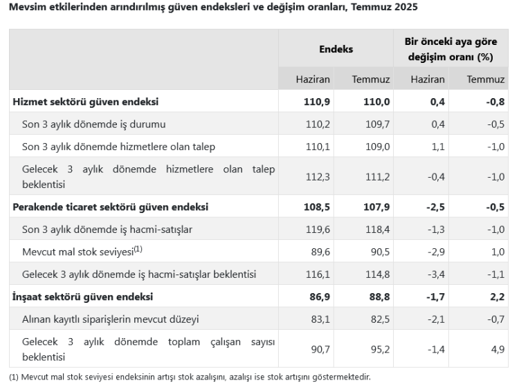 Türkiye İstatistik Kurumu’nun (TÜİK) verilerine göre, Temmuz 2025’te mevsim etkilerinden arındırılmış güven endeksi hizmet sektöründe yüzde 0,8, perakende ticaret sektöründe yüzde 0,5 azalırken, inşaat sektöründe yüzde 2,2 artış gösterdi.